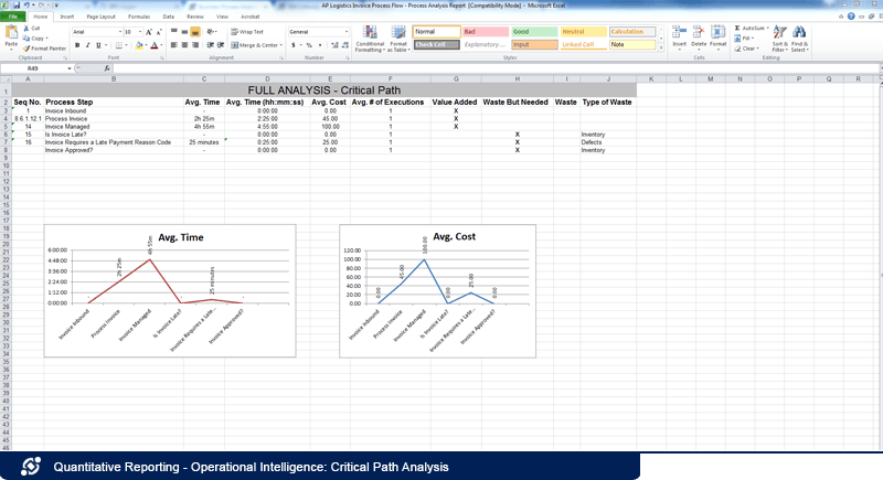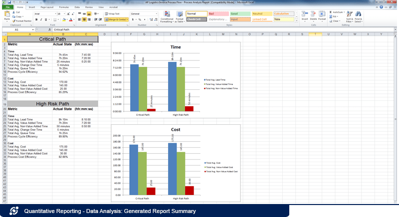 Aus Prozessanalysen extrahierte Daten (einschließlich benutzerdefinierter Attribute) können in Berichte exportiert werden, um operative Informationen für eine fundierte Entscheidungsfindung zu gewinnen. Diese können so programmiert werden, dass sie regelmäßig aktualisiert werden, und sie können Diagramme und Grafiken enthalten, um die Daten besser zu visualisieren und zu verstehen. Detaillierte kritische und risikoreiche Pfadanalysen können ebenfalls abgeleitet und schnell in Excel exportiert werden.