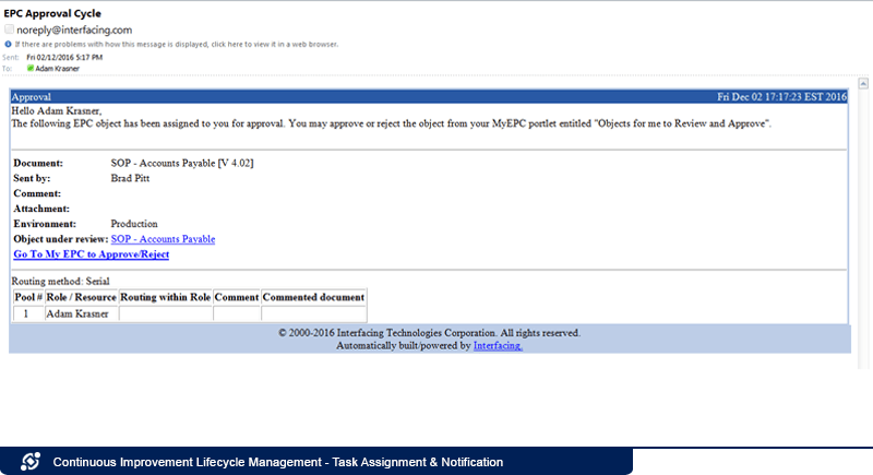 Wenn Prozesse als veraltet gekennzeichnet sind oder wenn ein Verbesserungsantrag eingereicht und genehmigt wurde, kann eine Benachrichtigung an einen bestimmten Mitarbeiter mit einer Anweisung zur Durchführung der Änderungen gesendet werden.