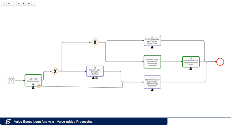 Durch die Anzeige von Aufgabenanalysen (Kosten, Dauer, Verzögerung…) direkt auf der Webkarte können Analysten auch feststellen, welche Arten von Verschwendung in einem Prozess vorkommen; sie können angeben, ob es sich um Defekt-, Bestands-, Bewegungs- oder Überverarbeitungsverschwendung handelt, und daher Kontrollen festlegen, um diese entweder zu beseitigen oder zu minimieren.